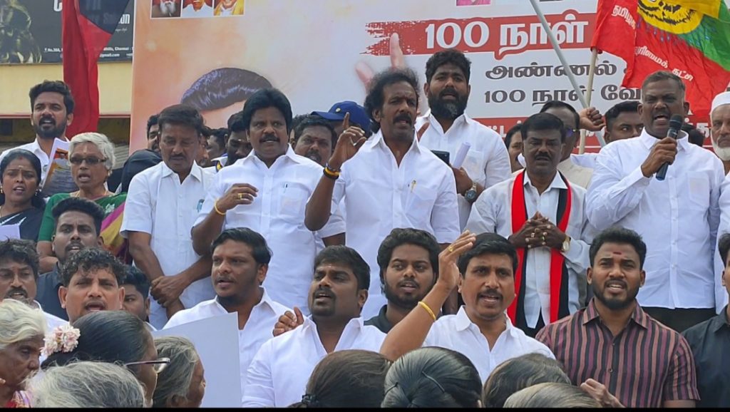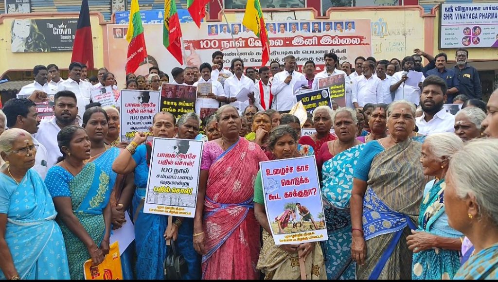 சென்னை வட கிழக்கு மாவட்டம் திமுக சார்பில் கழகத் துணைப் பொதுச் செயலாளர் ஆ. ராசாM.P. அவர்களின் அறிவுறுத்தலின்படி சென்னை வடகிழக்கு மாவட்ட செயலாளர் மாதவரம்S. சுதர்சனம்MLA, தலைமையில் மகாத்மா காந்தி பெயரை நீக்கி 100 நாள் வேலை திட்டத்தை